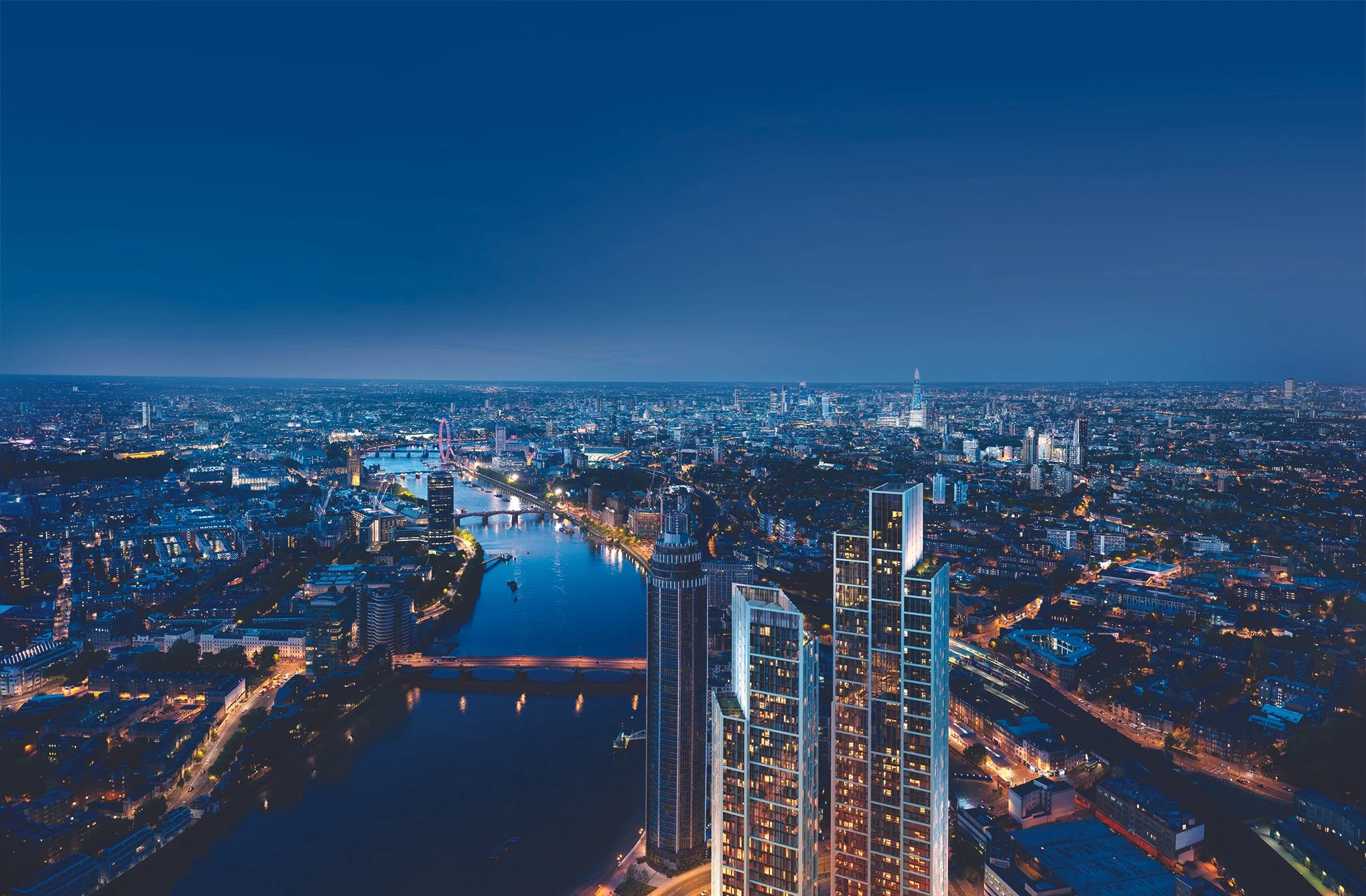One Nine Elms consta de dos torres unidas por un puente acristalado. River Park Tower tiene 57 plantas y 391 modernos apartamentos. El Park Hyatt London River Thames Residences, de 42 plantas, alberga 103 residencias de marca, gestionadas por el primer hotel Park Hyatt del Reino Unido.